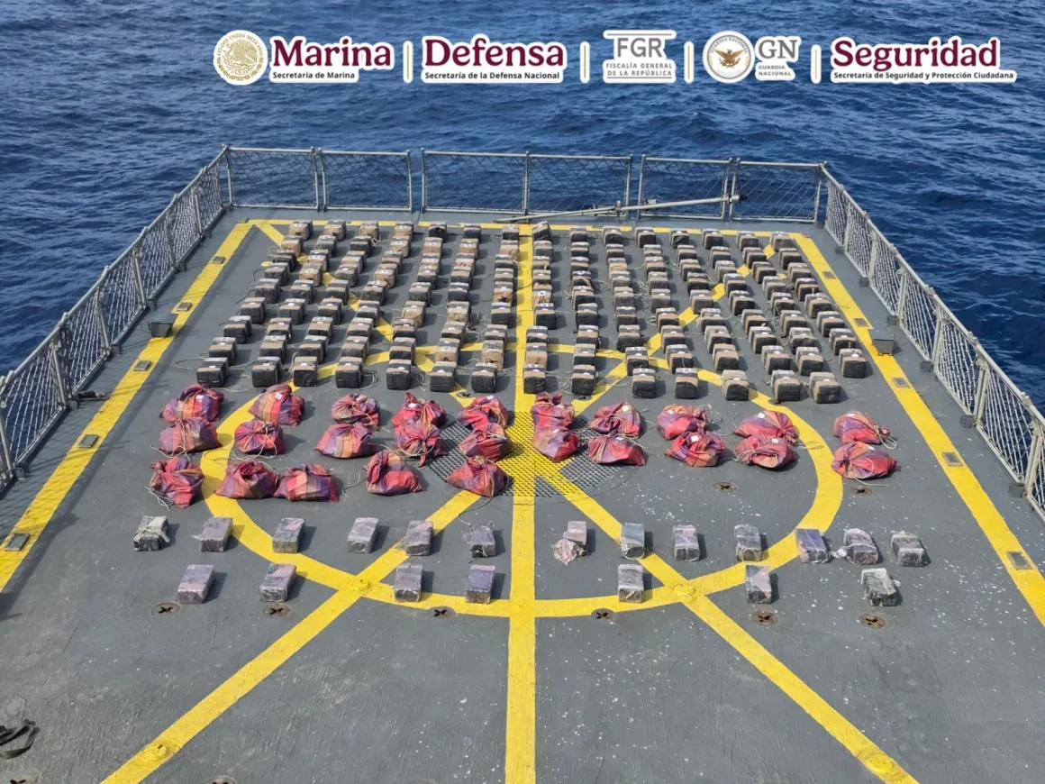 La Secretaría de Marina informó sobre la intercepción de una embarcación tipo semisumergible que transportaba una carga aproximada de cuatro toneladas de cocaína en aguas del océano Pacífico.